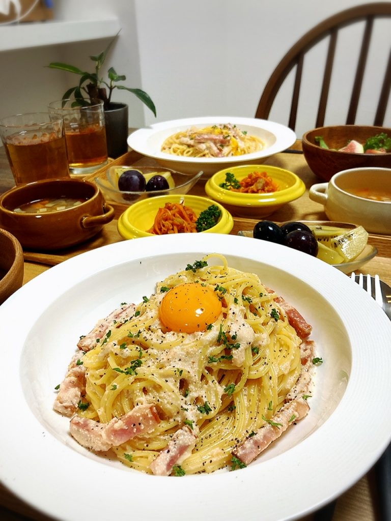 お皿に盛り付け、卵黄と黒胡椒をトッピングして完成。